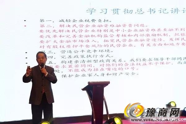 中央马克思主义理论研究和建设工程咨询委员会主任、中共河南省委原书记徐光春从国际国内经济环境、习主席在全国民营企业座谈会上的讲话重点讲解、民营企业家在新形势下如何应对经济困境三个方面作了精彩演讲。