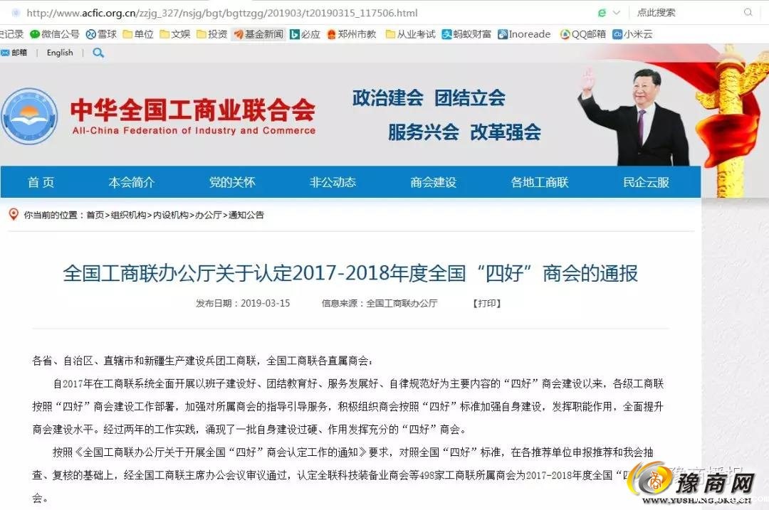 2019年3月15日,全国工商联在其官网上公布了《全国工商联办公厅关于认定2017-2018年度全国“四好”商会的通报》