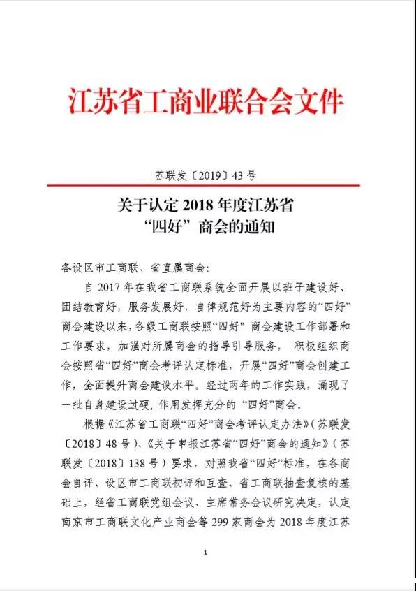 根据《江苏省工商联“四好”商会考评认定办法》、《关于申报江苏省“四好”商会的通知》要求,对照江苏省“四好”标准,在各商会自评、设区市工商联初评和互查、省工商联抽查复核的基础上,经省工商联党组会议、主席常务会议研究决定,认定常州市河南商会等299家商会为2018年度江苏省“四好”商会。