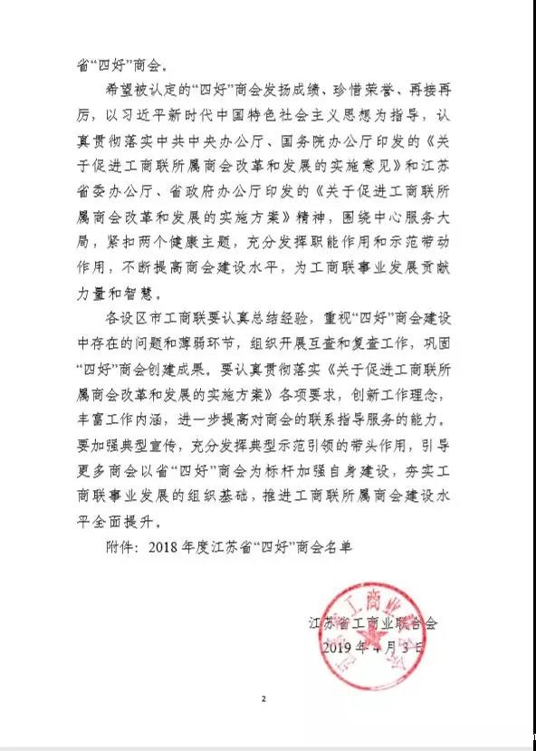 江苏省常州市工商业联合会发出文,关于认定2018年度江苏省“四好”商会的通知。