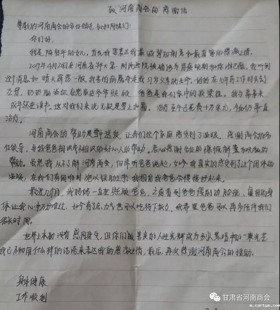 王主任把11900元爱心款交给了陈智华的姑娘。为感谢商会对陈智华的关爱,孩子写了一封«致河南商会的感谢信»。孩子在信中说:世上本没有感同身受,但大家善良的人性光辉成为别人黑暗中的一束光芒。