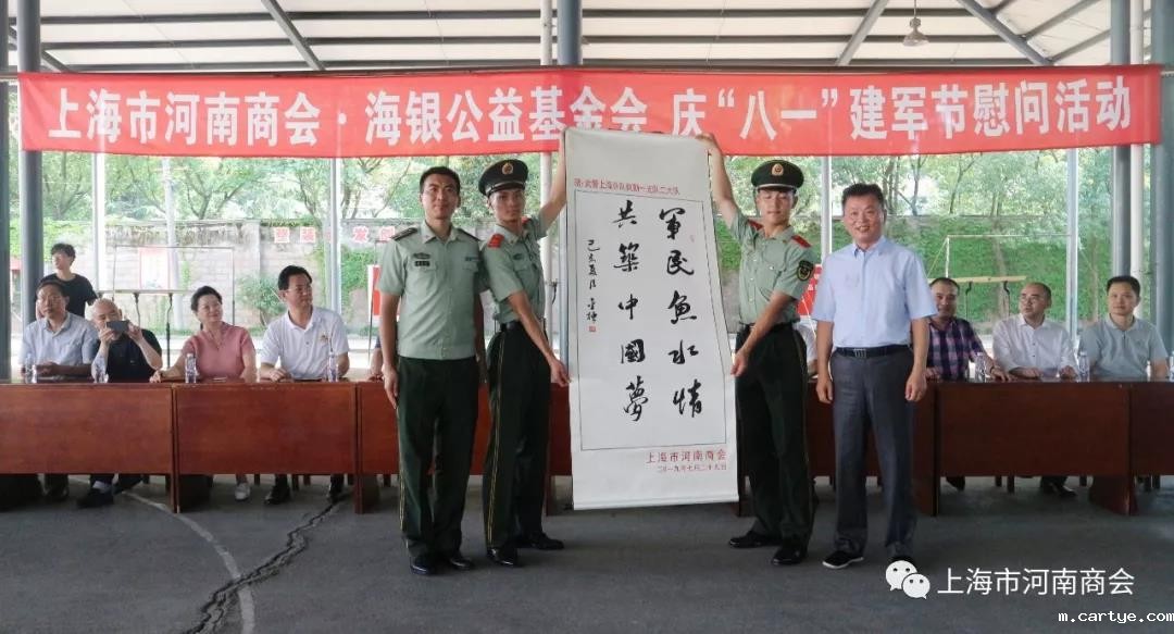 上海市河南商会近几年每逢八一前夕,都组织商会企业家走进军营,进行拥军慰问活动,不忘初心、牢记使命,为实现强军梦贡献一份力量。商会会长单位海银集团在拥军爱军方面也做出了具体的行动。2018年3月,海银发起设立了规模达1000万元的上海海银公益基金会退役军人专项基金;海银公益基金会先后联合上海市荣誉军人疗养院共同举办“关爱老兵”巡回义诊系列活动,慰问武警上海总队文工团的战士们;今年,海银将扶持一万到两万名退役军人助力其就业创业。这次拥军慰问活动,也是上海市河南商会和海银公益基金会践行拥军社会责任的具体体现。