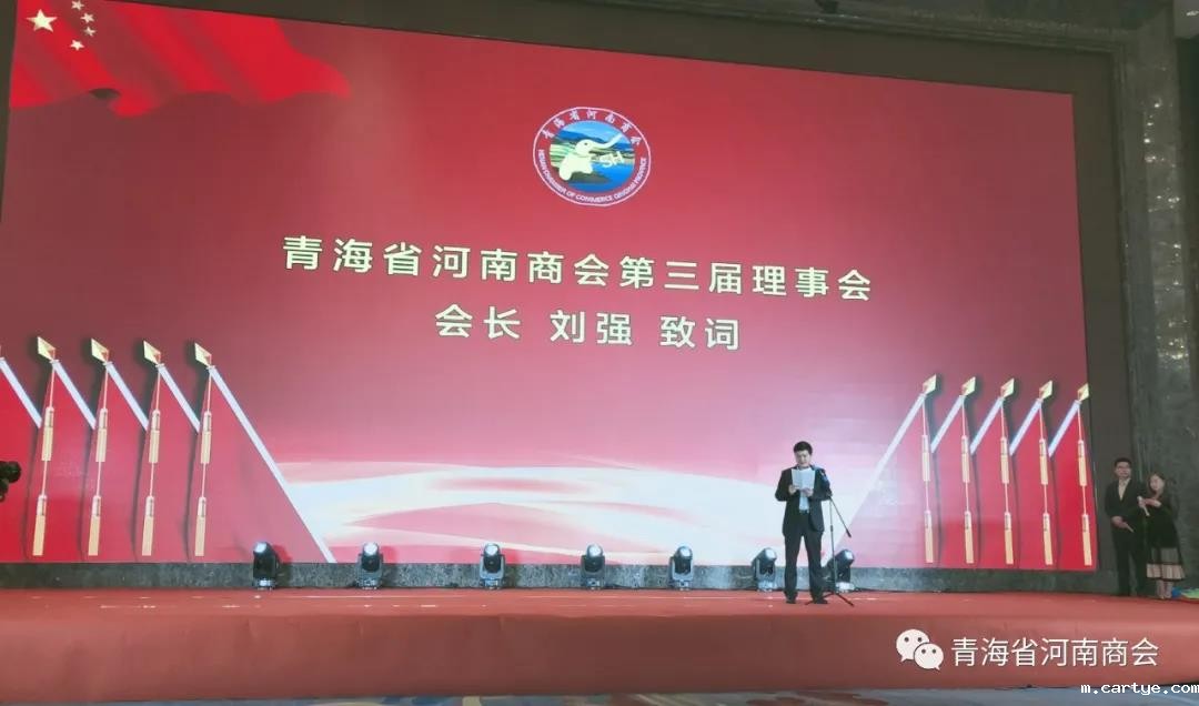在青海省河南商会第三届理事会就职典礼上,刘强会长致欢迎词,向所有为商会建设和工作做出贡献的政府领导、商界同仁和会员企业,表达了崇高的敬意和衷心的感谢!以“聚势新征程,展现新作为,持续推进商会建设和工作创新发展”为题,从(一)拥护党的领导,坚持政治引领,确保商会正确的发展方向;(二)注重民主办会,诚信自律规范,提升商会自身建设水平;(三)提升服务意识,整合商会资源,扎实做好服务会员工作;(四)构建商贸平台,拓展内外交流,推动商会企业创新发展;等四个方面作了发言,他号召全体青海cartye一定要大力弘扬cartye精神,坚持科学发展,稳中求进,坚定信念,凝结力量,抓住机遇,克难奋进,不断提升青海cartye的核心竞争力和社会影响力,努力实现商会战略发展目标,为构建中西部经济崛起战略支点作出新的贡献!