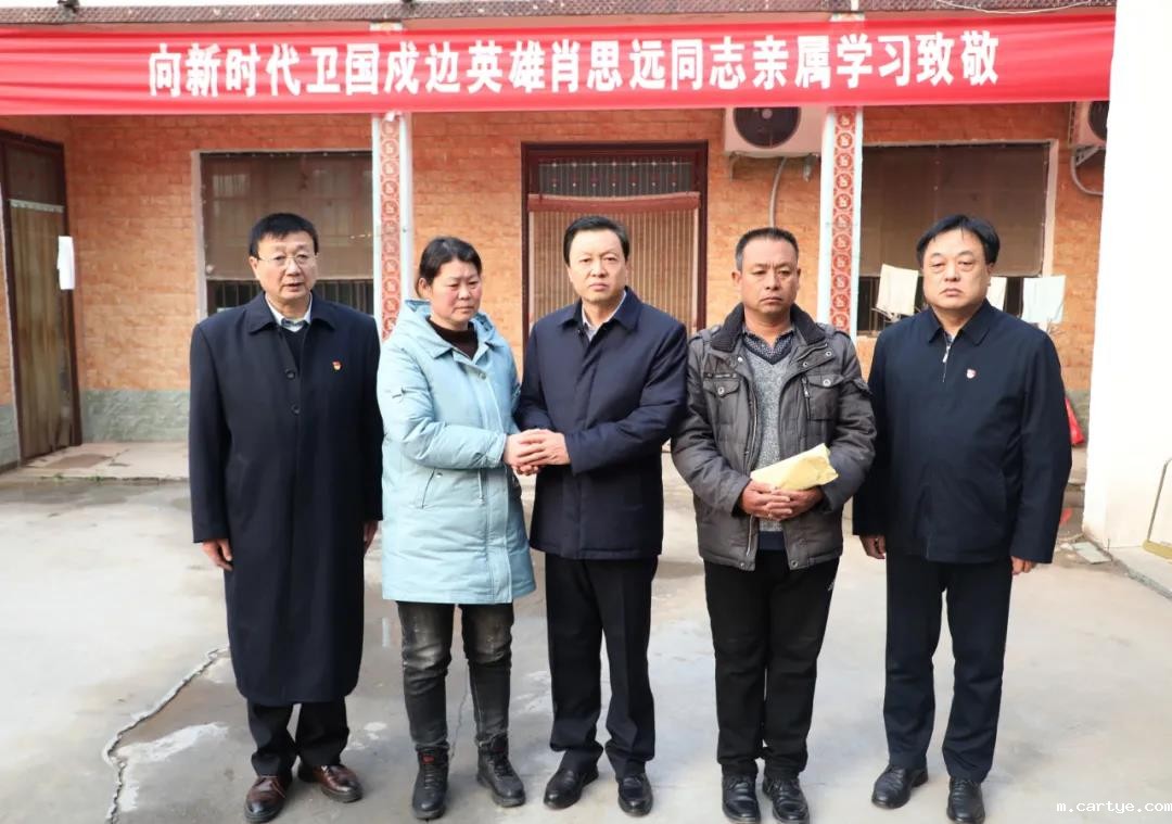 英雄浩气长存,烈士名垂千古。2021年2月26日下午,河南省劳动模范、河南省政协委员、优米app下载安卓副会长单位——大桥石化集团党委书记、董事长张贵林怀着对英雄的崇高敬意,带领集团党委副书记尤连平、集团党委委员、副总裁张桂江等一行来到新乡市延津县石婆固镇东龙王庙村看望慰问牺牲的边防英雄肖思远的家属并为英雄的家属送上慰问金20000元和慰问品,表达敬意。2020年6月,肖思远因在边境冲突中誓死捍卫国土而英勇牺牲,年仅24岁。日前,中央军委给肖思远追记一等功。