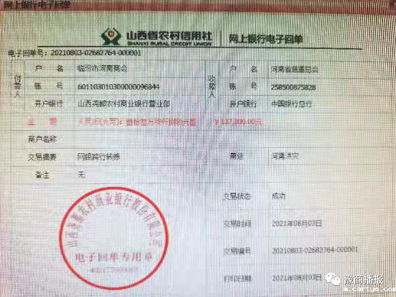 7月22日,临汾市河南商会第一时间召开班子成员会议,提出了为老家河南抗洪救灾捐款的倡议,发出了“临汾市河南商会支援郑州抗洪救灾捐款倡议书”。截至目前,共收到善款 137800元,善款专款专用,这些善款临汾市河南商会已向河南省慈善总会转账捐赠。