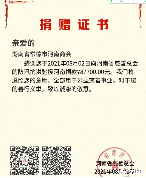 8月2日,常德市河南商会向河南省慈善总会捐款87700元,用于防汛抗洪驰援河南。