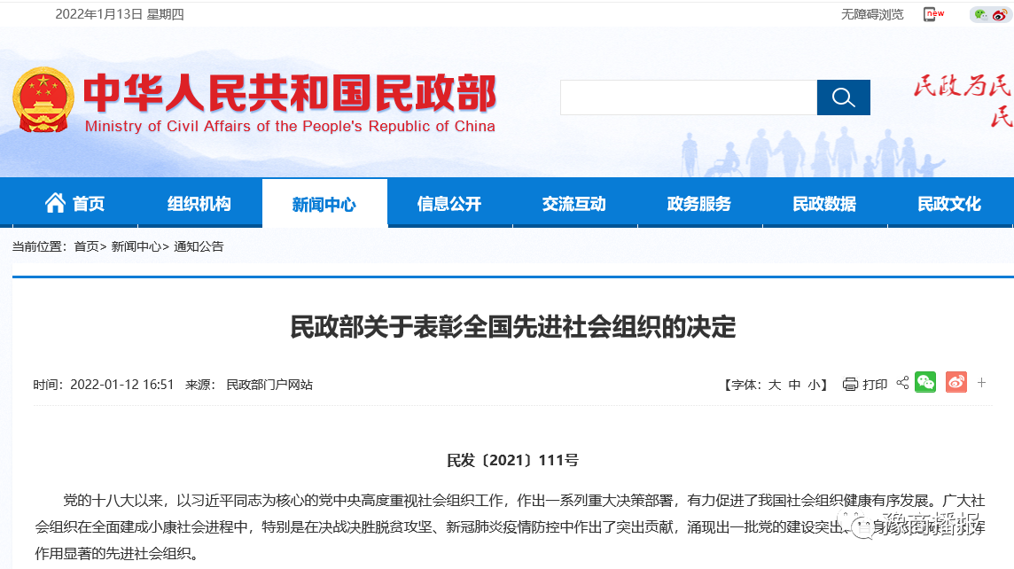 2022年1月12日,民政部官网发布了《关于表彰全国先进社会组织的决定》。《决定》指出,广大社会组织在全面建成小康社会进程中,特别是在决战决胜脱贫攻坚、新冠肺炎疫情防控中作出了突出贡献,涌现出一批党的建设突出、自身建设过硬、发挥作用显著的先进社会组织。为此,民政部启动了第四次“全国先进社会组织”评选表彰活动。经过推荐审核、意见征求、社会公示等程序,最终,全国共有哈密市河南商会等281个社会团体、社会服务机构和基金会被授予“全国先进社会组织”称号。