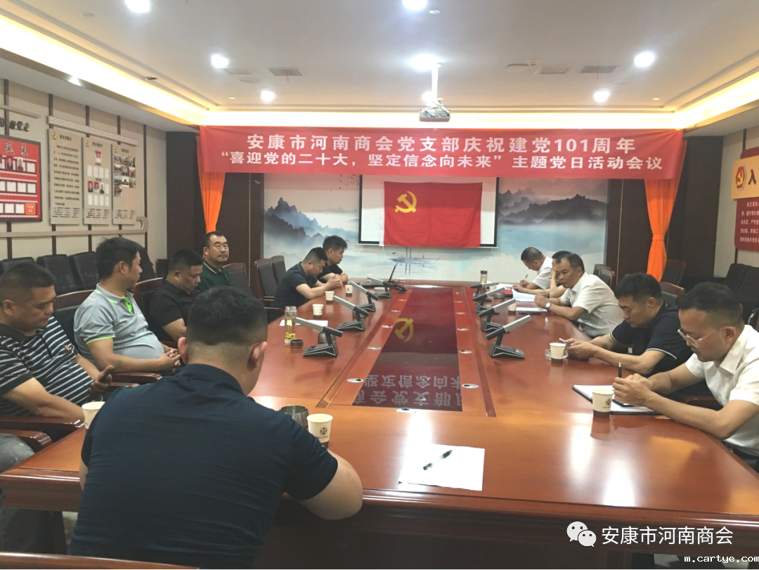 6月29日下午,安康市河南商会召开庆“七一”建党101周年“喜迎党的二十大,坚定信念向未来”主题党日活动。会上,支部书记赵士魁同志做了题为《坚持党性原则做政治上的明白人》的党课辅导。他讲到:作为共产党员,我们要始终坚持做到:一、不忘入党初心,牢记党员身份;二、不忘党的初心,传承红色基因;三、牢记党的嘱托,做政治上的明白人。他要求商会全体党员要努力做到“一心向党、一心为民、一身正气”。做为一个有26年党龄的老党员,支部书记赵士魁同志庄重而严肃地带领全体人员认真学习了《党章》,重温了入党誓词。