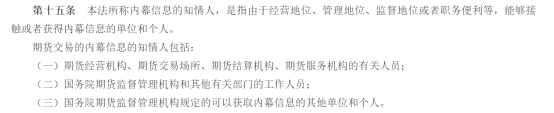 第13条明确规定,期货交易和衍生品交易的内幕信息的知情人和非法获取内幕信息的人,在内幕信息公开前不得从事相关期货交易或者衍生品交易,不得明示、暗示他人从事与内幕信息有关的期货交易或者衍生品交易,或者泄露内幕信息。第14条和第15条列出内幕信息及内幕信息知情人的概念。