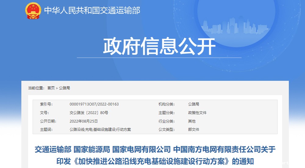 8月25日,交通运输部、国家能源局、国家电网、南方电网公布《加快推进公路沿线充电基础设施行动方案》。