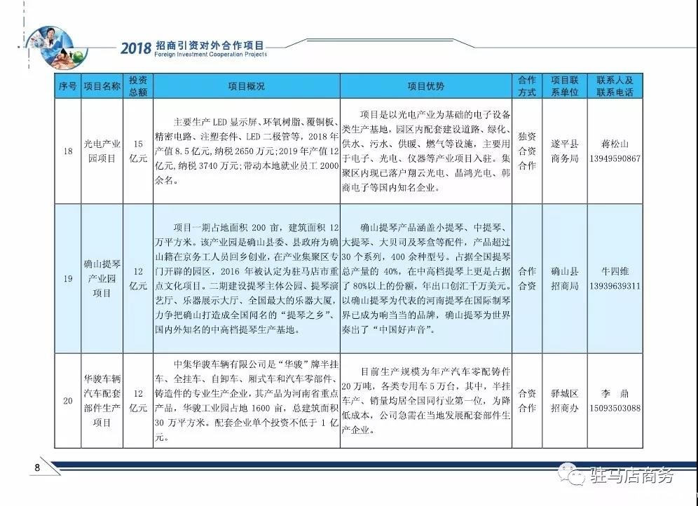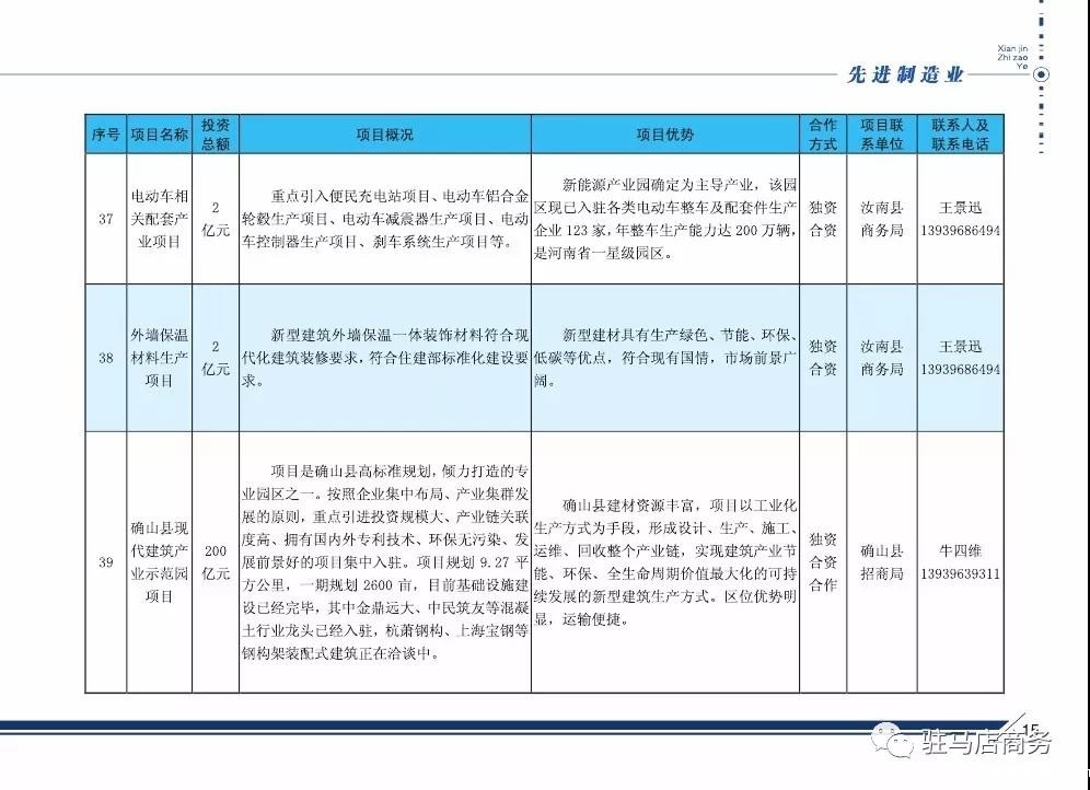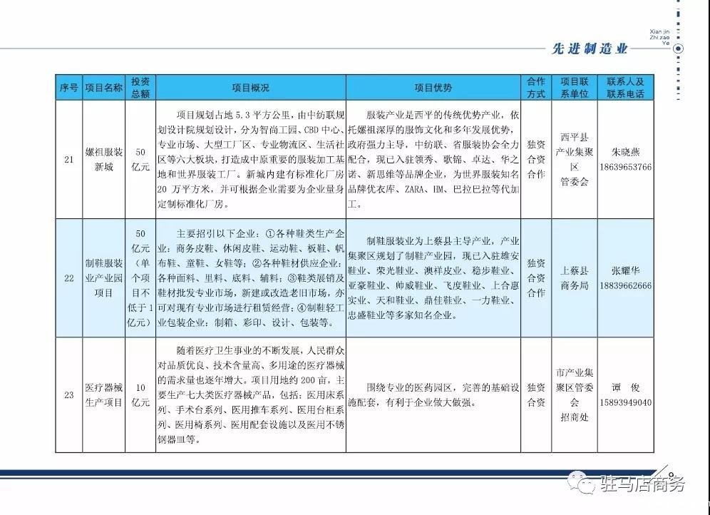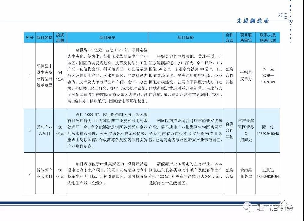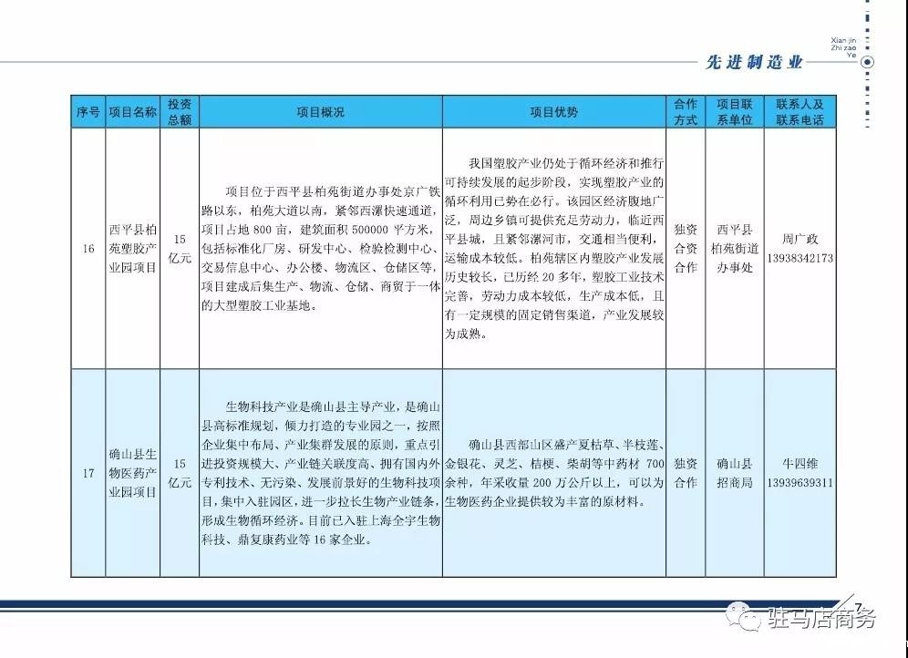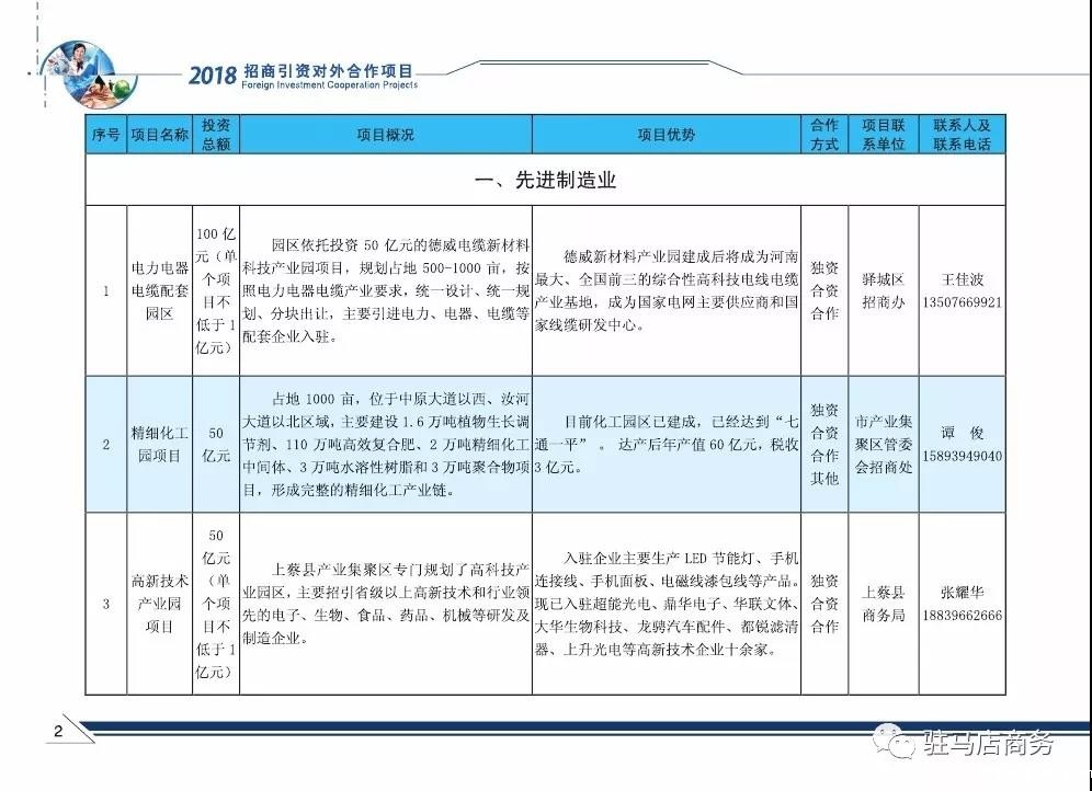 现将2018年驻马店市招商引资对外合作项目(先进制造业)发布如下: