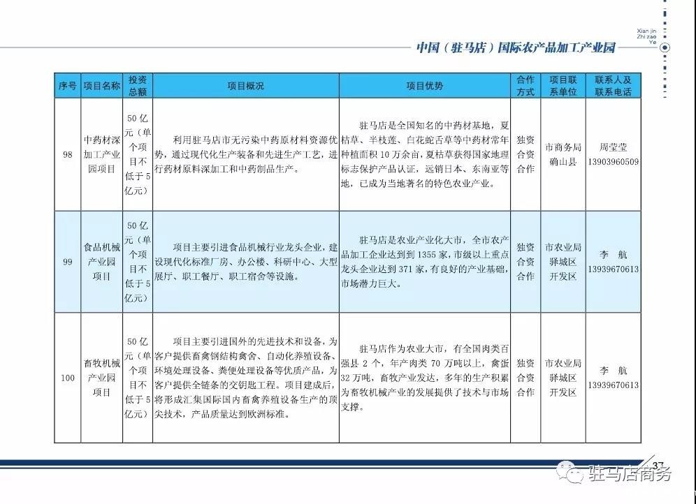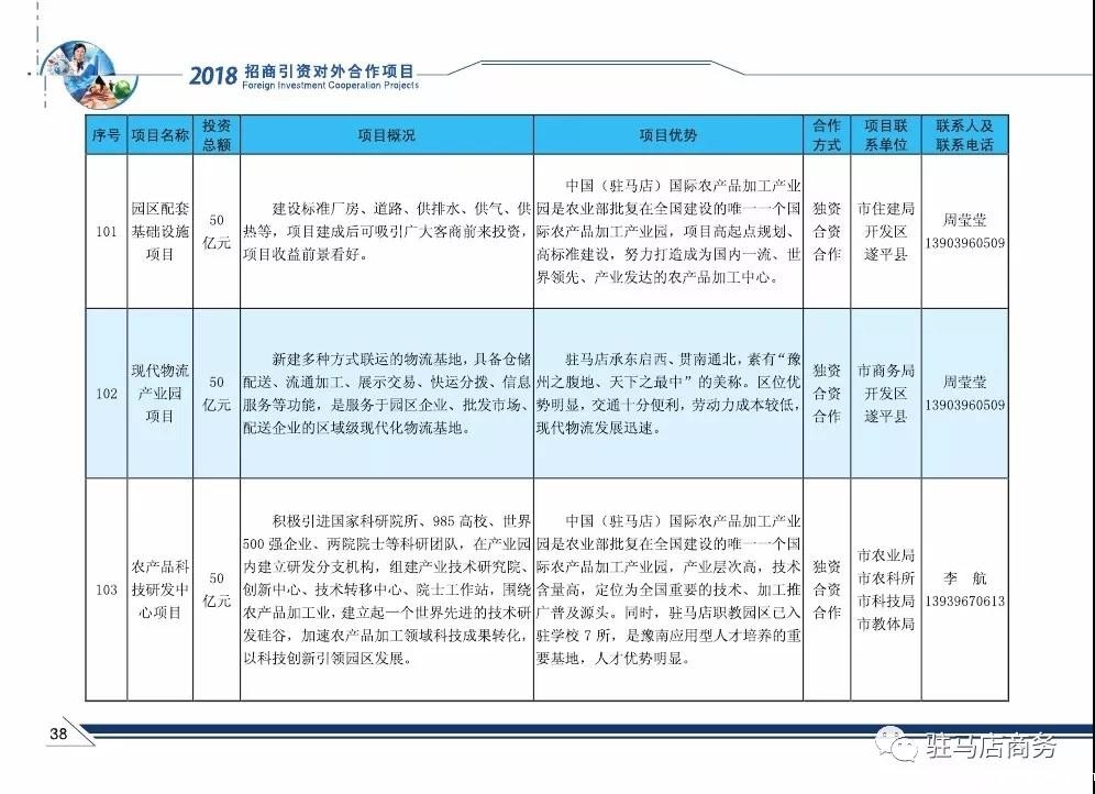 2018年驻马店市招商引资对外合作项目(先进制造业)