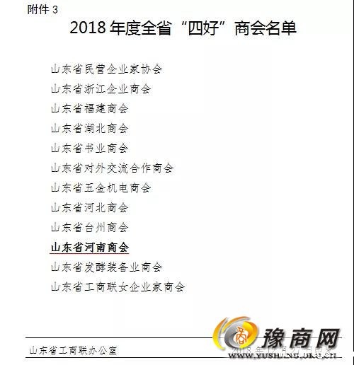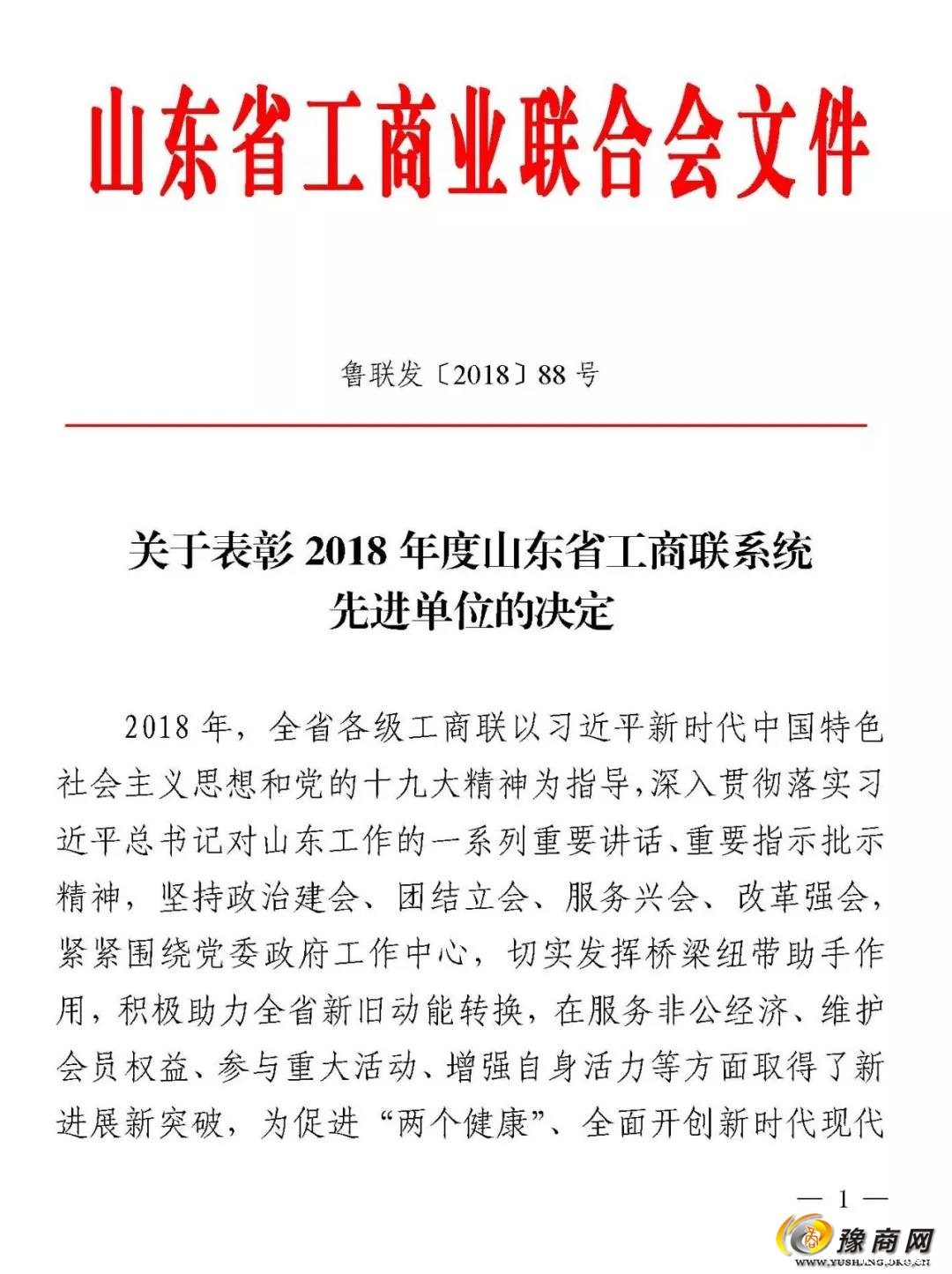 近日,山东省工商业联合会下发文件《关于表彰2018年度山东省工商联系统先进单位的决定》(鲁联发[2018]88号),山东省河南商会、泰安市河南商会、济宁市河南被认定为2018年度全省“四好”商会。