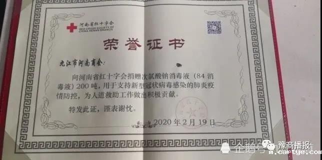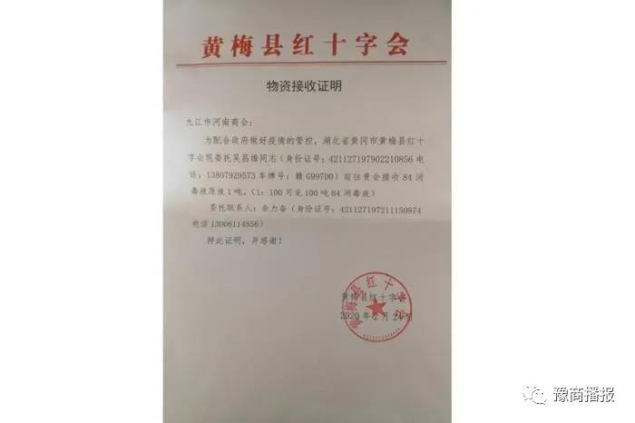 据九江市河南商会介绍,2月24号,商会向湖北省黄梅县捐赠84消毒液原液一吨(可),2月14号,商会向九江市教育局捐赠八四消毒液70吨。另外,商会还向濂溪区怡濂苑小区捐赠消毒液700公斤。