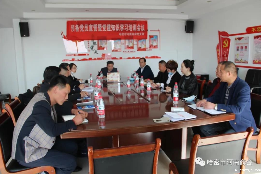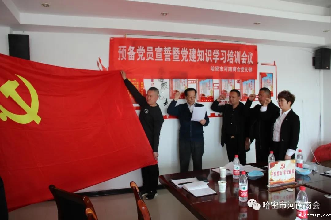 4月3日下午,哈密市河南商会举行预备党员宣誓暨党建知识学习培训会,支部成员、预备党员及入党积极分子参加了会议。会议由李国欣秘书长主持,首先参会党员全体起立齐唱《国际歌》,同时向在湖北武汉抗击新型冠状肺炎牺牲的医务工作者默哀。秘书长李国欣简要介绍了3名预备党员的基本情况,宣读了哈密市民政局社会组织综合党委《对接收3名同志为预备党员的审批意见》,并带领3名预备党员在党旗下庄严宣誓。