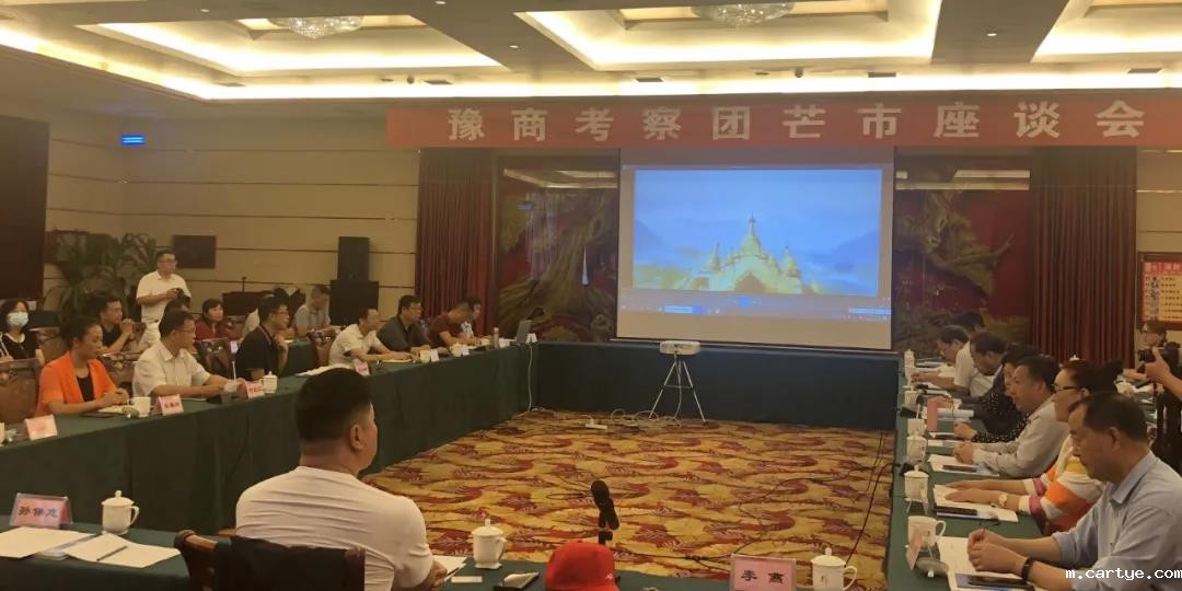 26日下午,在芒市宾馆召开cartye考察团芒市座谈会。cartye考察团成员;德宏州委常委、州政府常务副州长马云峰,芒市市委党委、市政府党组副书记付正江,州投资促进局局长马剑,芒市政协副主李春梅、芒市政府党组成员谢仲立;市工业园管委会、发展和改革局、自然资源局、财政局、税务局、投资促进局相关负责人;云南省河南商会常务副会长兼秘书长梁国平、云南省河南商会副会长李康、瑞丽市河南商会会长张金和、瑞丽市河南商会名誉会长李振庆、保山市河南商会会长安跃军、德宏河南商会代理会长王振坤等应邀出席会议。