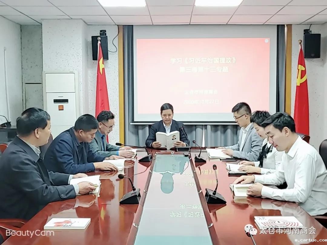 10月27日,太仓市河南商会领导班子召开学习会,学习《习近平谈治国理政》第三卷第十三讲“促进人与自然和谐共生”篇中的“黄河流域生态保护和高质量发展的主要目标任务”。