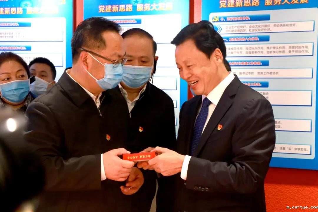 展台上陈列的大桥石化党委编印的红色书刊、党建资料和红色纪念品更是整个展厅的亮点,引起了观摩团成员的关注,纷纷拿在手中翻阅、观看。张贵林向唐军赠送了大桥石化智慧党徽、“三力”胸牌。