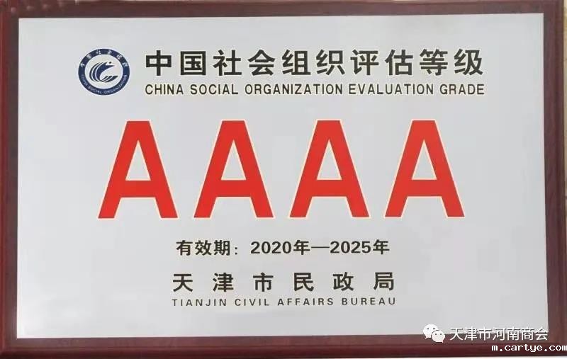 2020年12月8日,天津市民政局公共服务平台网发布公告,宣布了社会组织评估等级名单,天津市河南商会被评定为天津市4A级社会组织。这是国家民政部门对天津市河南商会工作的高度肯定,是全体会员同心协力,团结奋进的结果,也是商会成立四年多来发展道路上的一个重要里程碑,它有效提升了商会的公信力,给商会注入了新的活力,成为商会历史的转折点和发展的新起点。