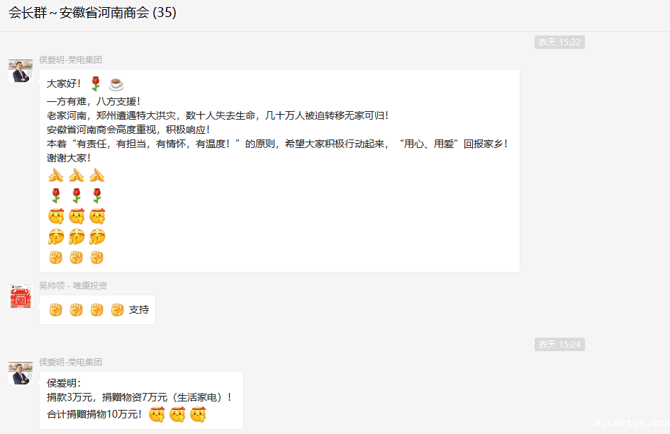 河南灾情牵动着亿万国人的心,家乡群众的安危更是牵动着各地cartye的心。灾难无情人有情!老家河南有难,各地cartye心系家乡,纷纷通过优米app下载安卓向受灾地区发来慰问、对河南乡亲表示关心,有的商会还开始采取行动,通过各种渠道向河南捐款捐物,支援家乡的救灾、减灾工作。下面是截止7月23日上午十点的信息汇总: