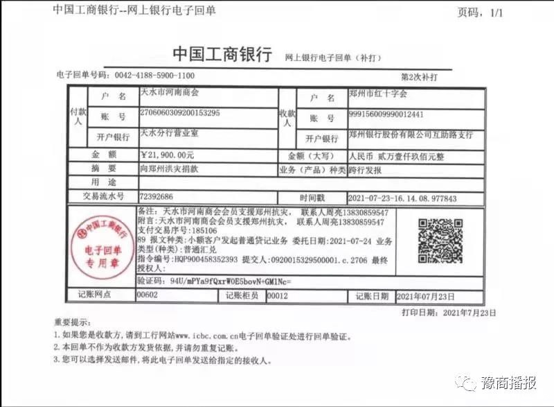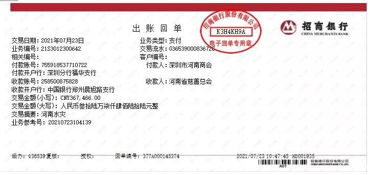 7月21日,由河南省人民政府驻广州办事处深圳联络处、深圳市河南商会共同发起“关于防汛抗洪驰援河南爱心募捐倡议书”,号召商会企业家和社会各界人士积极为河南灾区捐资助力,为防汛抢险贡献爱心力量。截至7月23日15:00,商会共收到来自222位会员及爱心人士的善款,总计409475.16元。目前,善款已全部捐至河南省慈善总会,助力抗洪第一线。(说明:汇款凭证共三张,版面有限这里只发了一张)。