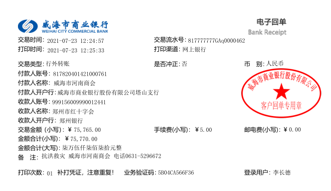 7月21日,威海市河南商会发出关于向郑州防汛抗灾募捐的倡议书,截至2021年7月23日12:00,响应威海市河南商会倡议的已有135人(或单位),累计捐款85765元,均已转至郑州市红十字会官方账户,其中75765元由威海市河南商会账户转出,10000元由捐款企业河南港航自行转入郑州市红十字会。