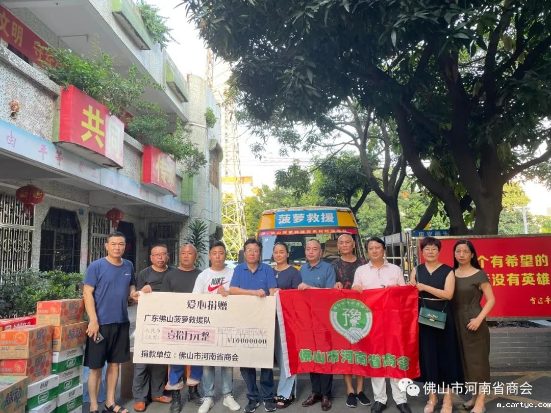 7月22日上午,佛山市河南省商会发出捐助倡议,号召会员、老乡和各界爱心人士捐资捐物,紧急支援老家。商会会长孙太海一行带着筹集到的首批十万元善款,当面交给佛山市菠萝救援队,委托他们前往灾区救援。截止7月23日下午2点,商会已募集捐款209928元,参与捐款人数121人。