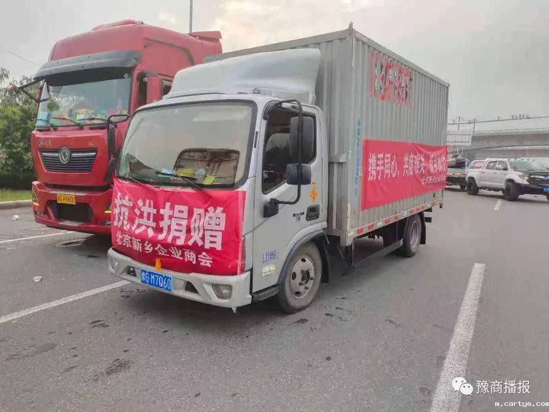 北京新乡企业商会"抗洪捐赠"车,满载物资,24日04时起在京港澳高速新乡出口处,排队等待向新乡市红十字会交接物资。此次捐赠中,北京新乡企业商会的代监事长盈科律师事务所合伙人户四民向中华慈善总会捐赠“河南防汛救灾”捐款100万元。