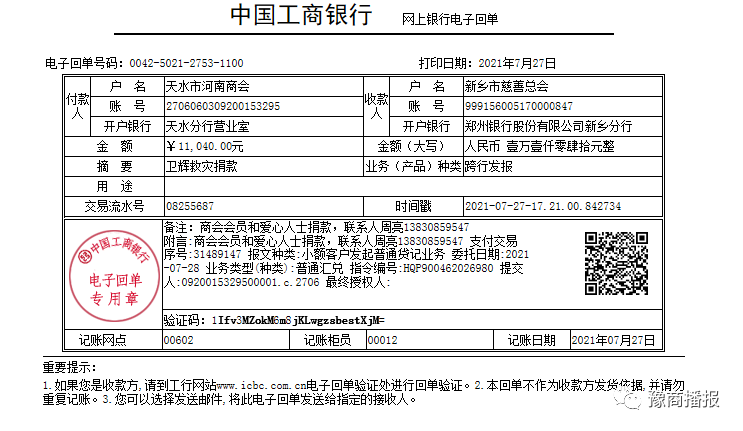 天水市河南商会党支部积极倡议,动员向河南灾区捐款捐物。两天时间,商会收到首批善款21900元,捐给了郑州市红十字会。7月25日,商会向赴新乡救灾的天水市救援协会提供一批常用药品和急救药品,由红爆救援队带到新乡救灾一线。7月27日下午,由社会爱心人士和河南老乡捐助的第二笔善款11040元,转给新乡市慈善总会,并指定用于卫辉市救灾工作。