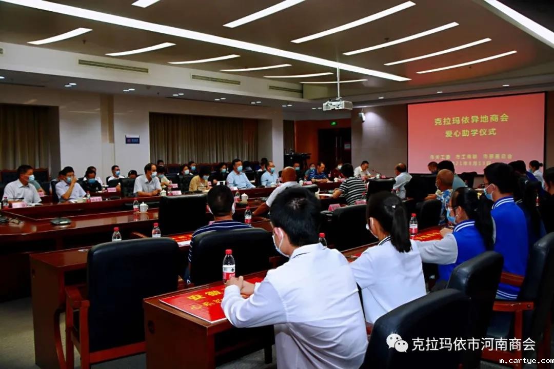 2021年8月13日,克拉玛依河南商会参加了由克拉玛依市关心下一代工作委员会和市工商联组织的异地商会爱心助学仪式。商会副会长王彬代表克拉玛依河南商会,和其他商会负责人一起,将各自商会捐赠的助学金交到学生手中。