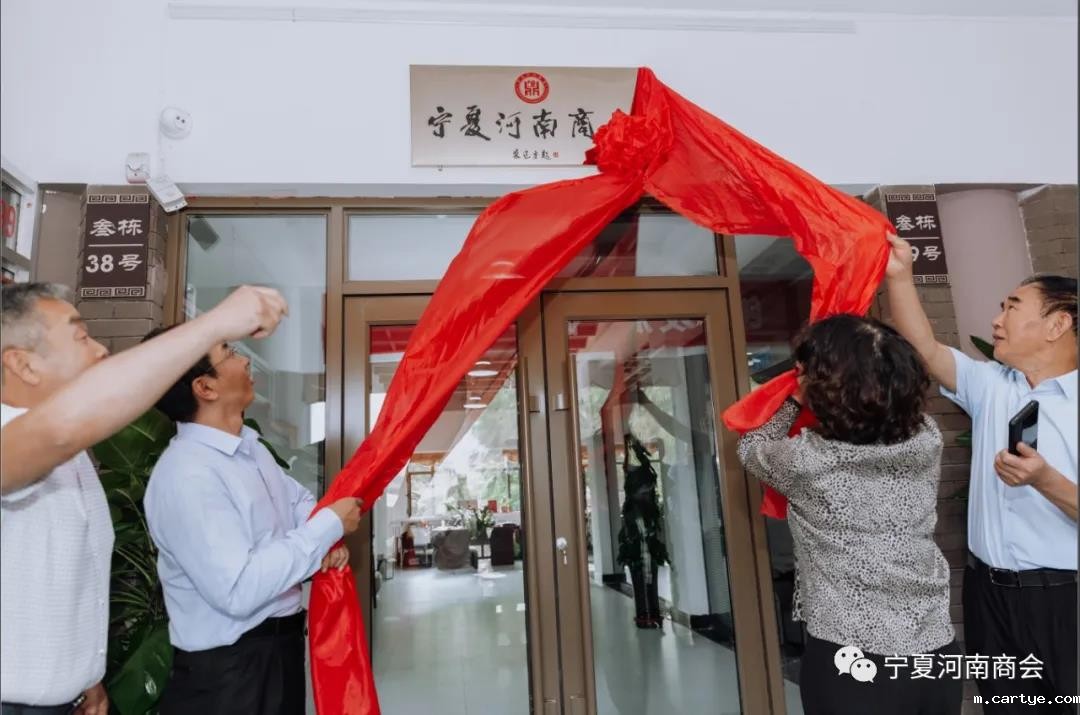 自治区党委统战部副部长、自治区工商联党组书记魏莉同志、宁夏河南商会华贵普会长、宁夏河南商会海宪甫名誉会长、自治区民政厅社会组织管理局王佳宁同志共同拉动红绸,为新成立的宁夏河南商会揭牌。