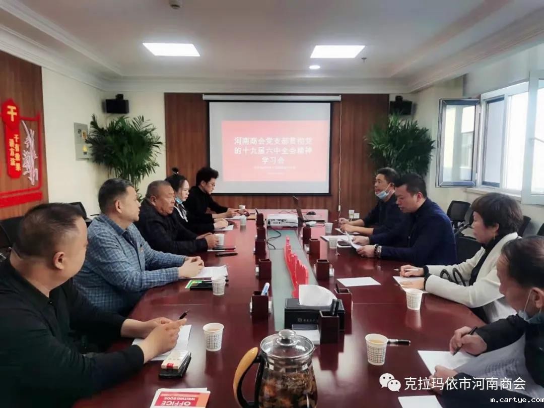 克拉玛依市河南商会党支部组织党员、重点培养发展对象、入党积极分子在鼎泰集团5楼会议室召开专题学习会。会上,大家全文学习了中国共产党十九届六中全会(中共中央关于党的百年奋斗重大成就和历史经验的决议),并结合自己的成长、发展和学习收获认识,围绕我党百年奋斗历程和取得的伟大成就,身有感触地积极畅谈发言。十九届六中全会召开期间,党支部安排有条件的会员企业负责,组织商会全员收看会议现场视频,并充分利用商会会议、各会员小组会议的时机,把学习(决议)做为主要内容安排,目前在克拉玛依河南商会,学决议、知党史、感党恩学习教育活动正在深入开展。