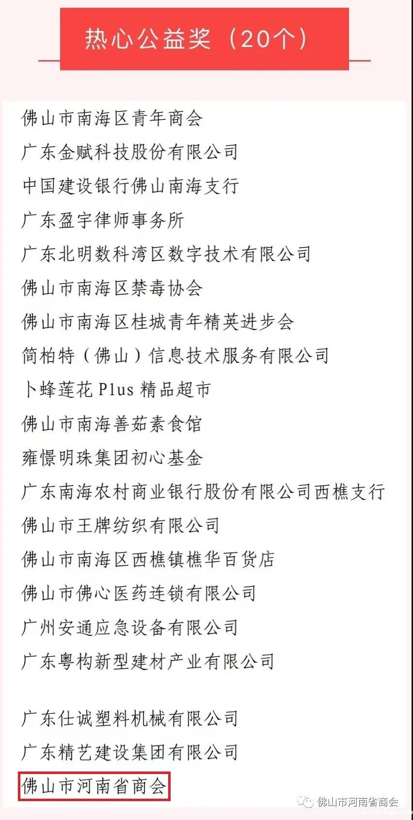 佛山市河南省商会喜获“热心公益奖”光荣称号。