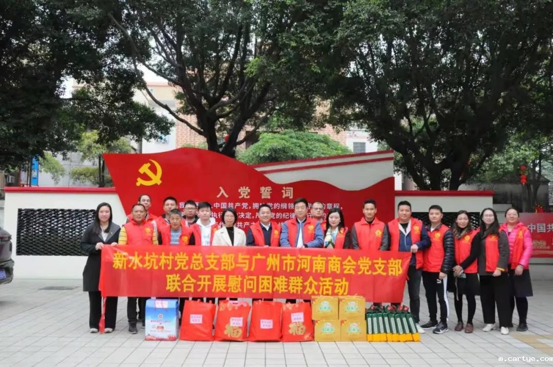 1月14日,广州市河南商会党支部与番禺区新水坑党总支共同看望本村八户困难群众,为八户群众赠送大米、油和红包。广州市河南商会党支部书记翟德岭、委员李自卫,副会长赵梅、亚洲国旅工作人员朱小莲、刘慧丽一行和困难群众亲切交谈,并送上新年祝福。