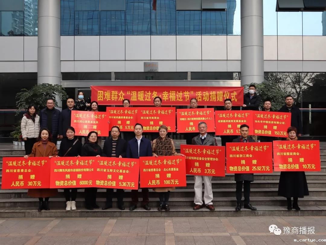 1月17日,在四川省民政厅举行“温暖过冬幸福过节”活动捐赠仪式上,四川省河南商会迅速响应号召,积极参加慈善捐赠活动,向广安市广安区困难群众捐赠羽绒服200件,助力困难群众温暖过冬幸福过节,让困难群众感受到党委、政府和社会各界的关爱,感受到浓浓的、温暖的新春节日氛围。