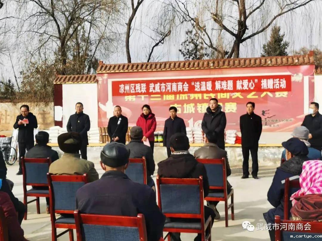 1月26日,武威市河南商会携手凉州区残联在古城镇举办了“送温暖、解难题、献爱心”助残捐赠活动。武威市河南商会会长董开斌、秘书长王富华、执行会长蒋辉、许金华、常务副会长刘威、副会长宋先锋、胡仁林一行,在活动现场向当地残疾群众捐赠了轮椅、防褥疮坐垫、拐杖、助听器和盲杖等辅助器具,为生活困难的残疾人家庭捐赠了米、面、食用油和春联等生活用品。