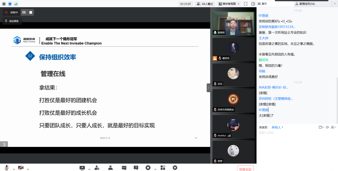 5月12日,苏州市湖南商会与苏州市山东商会等当地商会联合主办了《后疫情时代的团队管理》线上直播公开课。课程中,特邀专家娄德明围绕“疫情之下的思考”与如何“保持组织效率”两个议题,分析当前疫情给企业带来机遇与挑战,并结合自身经历,以典型的实例和精辟的分析,阐明了当前复杂的工作模式也能够变现为有价值且高效的方式,不仅可以更广泛地利用人才库,同时还能提升员工的参与度和创新力。整场活动干货满满,收获颇丰,精彩的课程得到了商会会员的普遍赞誉,为企业家顺利过渡后疫情时期、解决实际问题提供了切实帮助。