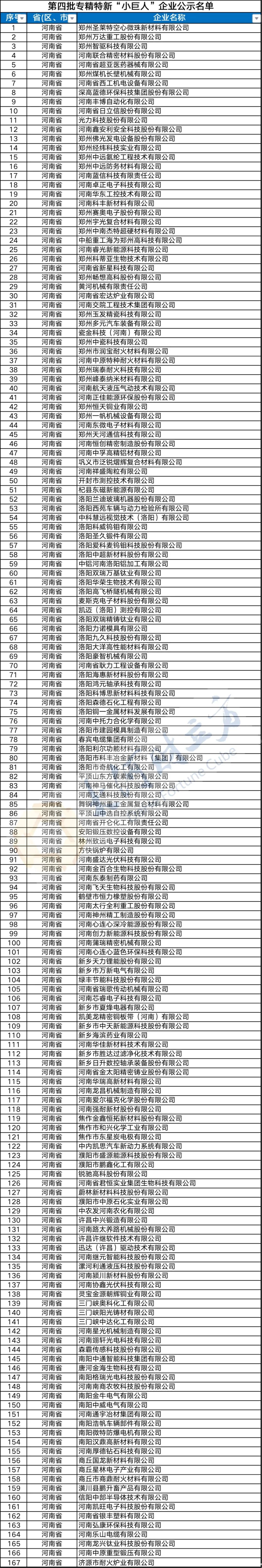 8月9日,记者从河南省工信厅中小企业局获悉,经工信部认定的第四批专精特新“小巨人”企业目前正在公示,河南共有167家企业上榜,同时,第一批专精特新“小巨人”中河南4家企业通过复核(下附名单)。