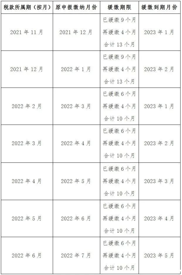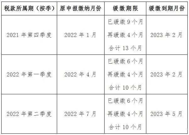 所属期是2021年11月、12月(包括按季缴纳的2021年第四季度税费)缓缴税费在延长9个月的基础上继续延长4个月(合计延长13个月),分别在2023年1月、2月入库。