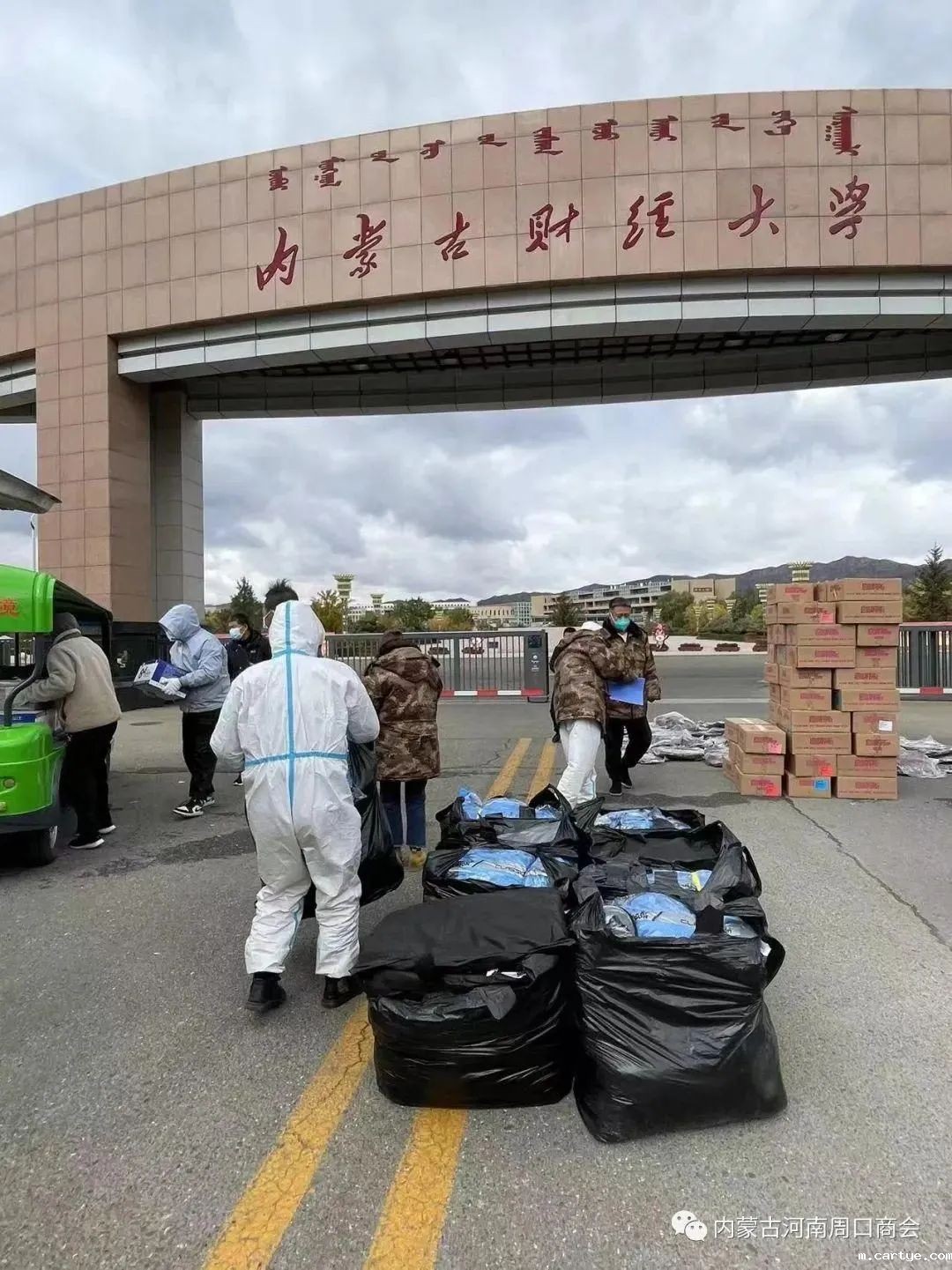 近日,呼和浩特市疫情防控形势异常严峻,内蒙古河南周口商会积极响应自治区工商联防疫号召,商会会长赵书清带领班子成员经研究决定,自筹资金10万余元,用于购买防疫、防寒物资。10月9日,内蒙古河南周口商会得知当地内蒙古财经学院的部分同学们没能回家拿保暖棉衣,气温骤降急需保暖衣物保暖。得知消息后,内蒙古河南周口商会购买了200件保暖棉衣、独立医用外科口罩、消毒液、医用体温抢等大量防寒防疫物资近10万余元,及时送到了内蒙古财经大学同学们的手中,使同学们及时得到了温暖和防疫保障!