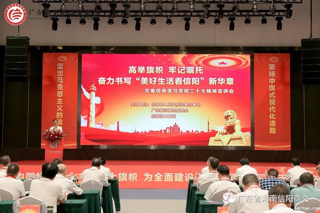 为了在第一时间让广大在粤的信阳cartye深入学习领会二十大精神,深入把握我们党执政规律、奋斗方向,10月26日,广东省河南信阳商会与信阳市人民政府驻粤办事处、信阳市工商联在东莞市厚街黄金小镇1号楼三楼会议厅联合举办了“高举旗帜、牢记嘱托、奋力书写美好生活看信阳新华章”的学习贯彻二十大精神宣讲会。