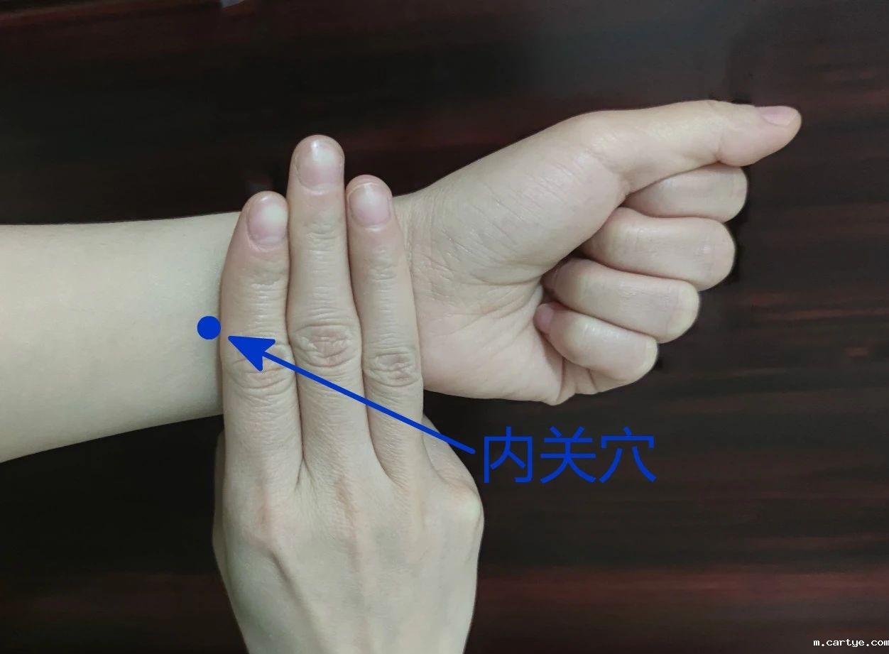 方法:以一手拇指指腹紧按另一前臂内侧的内关穴,先向下按,再作向心性按压,左右旋转各10次,然后紧压1分钟。两手交替进行。