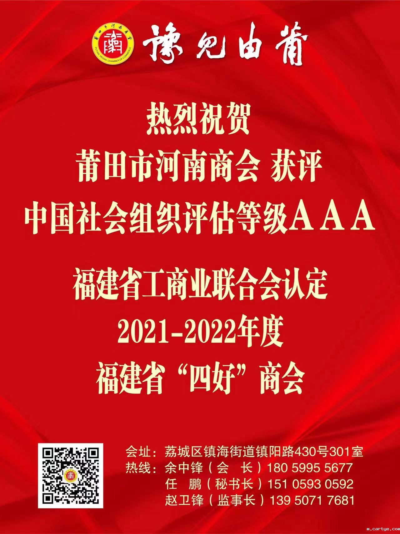 近日,莆田市河南商会荣获福建省工商业联合会认定的2021-2022年度福建省“四好”商会,和莆田市民政厅评定的AAA等级商会。商会表示,将珍惜荣誉、再接再厉,积极打造中国特色一流商会。