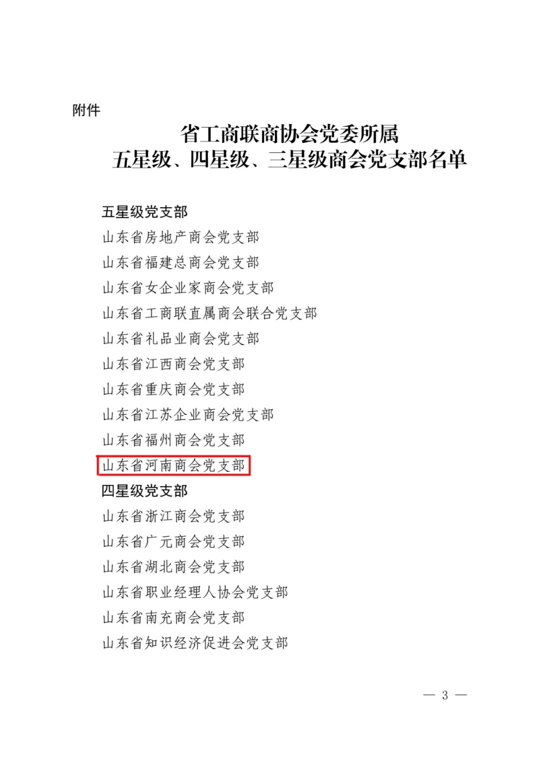 6月12日,中共山东省工商业联合会商会协会委员会下发《关于山东省工商联商协会党委所属商会党支部评星定级结果的通报》(鲁联商协党发﹝2023﹞14号),山东省河南商会党支部被评为“五星级党支部”。