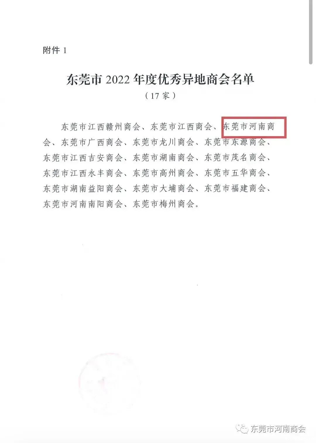 2023年10月30日,东莞市公布了《2022年度异地商会积分制管理评审结果》,其中,东莞市河南商会荣获年度优秀异地商会。此外,东莞市河南商会还荣获东莞市2022年度平安文化创建优秀异地商会荣誉称号。