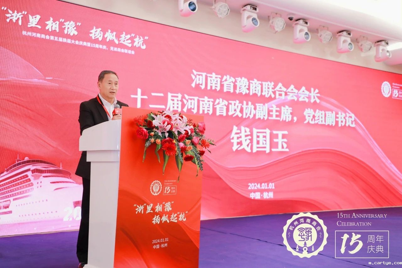 钱国玉对在浙cartye经历风雨、克服困难,坚持开拓创新的拼搏精神表示赞赏,希望大家把握国家促进民营经济发展的政策和形势,树立发展信心,及时调整赛道,开拓新的市场,把事业产业做牢、做深、做实,继续为家乡争光添彩。希望浙江省河南商会要不断创新,提升商会的服务能力,积极帮助会员,促进cartye发展;要密切与当地政府的关系,发挥政企业之间的桥梁作用,努力维护会员的合法权益;要加强内部管理机制建设,健全完善工作制度,提升商会的工作能力和服务水平。