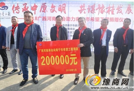 1 月 22 日,由共青团南宁市委、广西河南商会主办的广西河南商会助力南宁市希望工程捐赠仪式在上林县白圩镇中心小学覃排分校举行,广西河南商会不仅捐赠 20 万元现金,还给学校捐赠大米、食用油、衣物及学习、体育用品一大批以及爱心礼物,6 名贫困家庭学生代表领取了助学金。