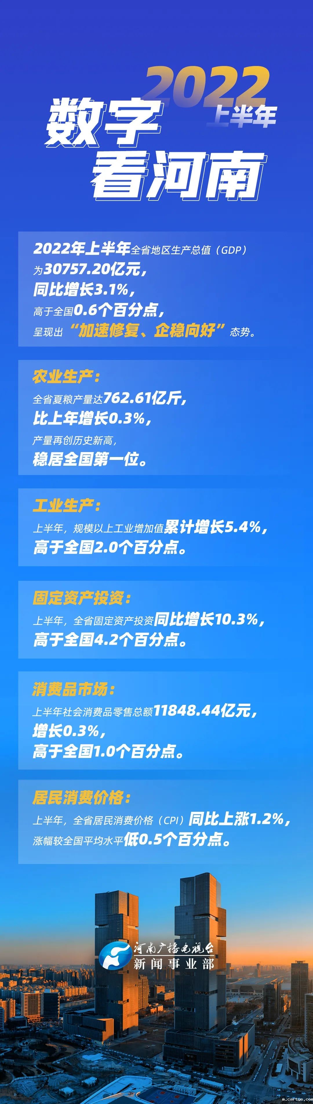 7月20日,河南省政府新闻办召开的“2022年上半年河南省经济运行情况”新闻发布会上介绍说,今年上半年全省地区生产总值(GDP)为30757.20亿元,同比增长3.1%,高于全国0.6个百分点。扭转了自2020年三季度以来连续7个季度累计增速低于全国的被动局面。分产业看,第一产业增加值2355.52亿元,增长4.5%;第二产业增加值13490.99亿元,增长3.9%;第三产业增加值14910.69亿元,增长2.2%。二季度,全省GDP为16528.42亿元,同比增长1.7%,高于全国1.3个百分点。