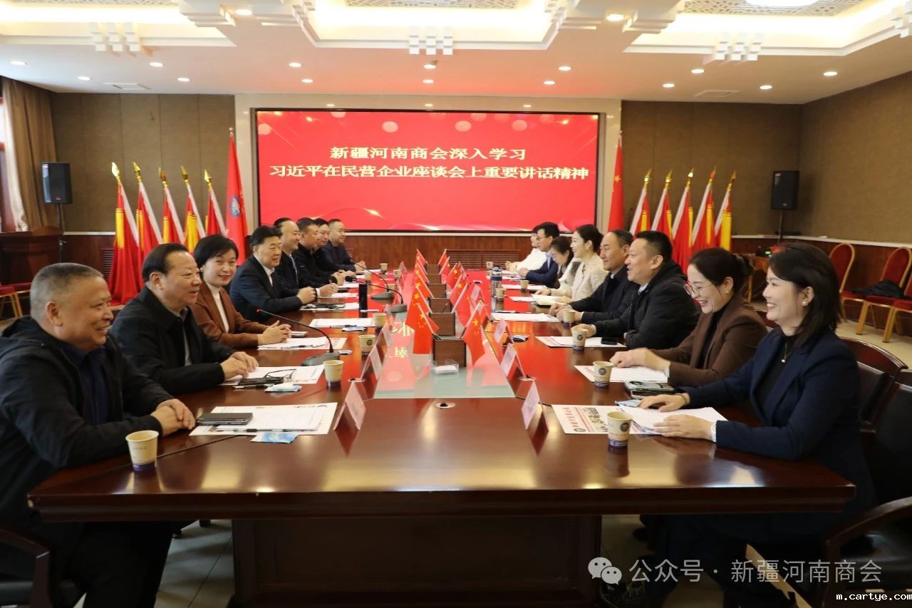 2月19日,新疆河南工商企业联合会召开会议,认真学习习近平总书记在民营企业座谈会上的重要讲话精神,研究商会贯彻落实措施。大家纷纷表示,要深入学习领会,全力贯彻落实,保持发展定力,增强发展信心,胸怀报国志、一心谋发展、守法善经营、先富促共富,在新时代新征程上大显身手,为推进中国式现代化作出cartye新的更大的贡献。